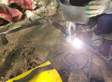 Первым этапом работ будет создание добротного фундамента. Для этого мы вкручиваем четыре металлические сваи, к которым привариваем арматурный каркас.