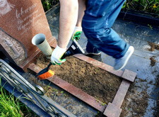 Приехав на кладбище, первым делом мы удалили кустарник, закрывающий памятник. Затем тщательно подмели цветник и территорию участка, после чего вытерли надгробье.